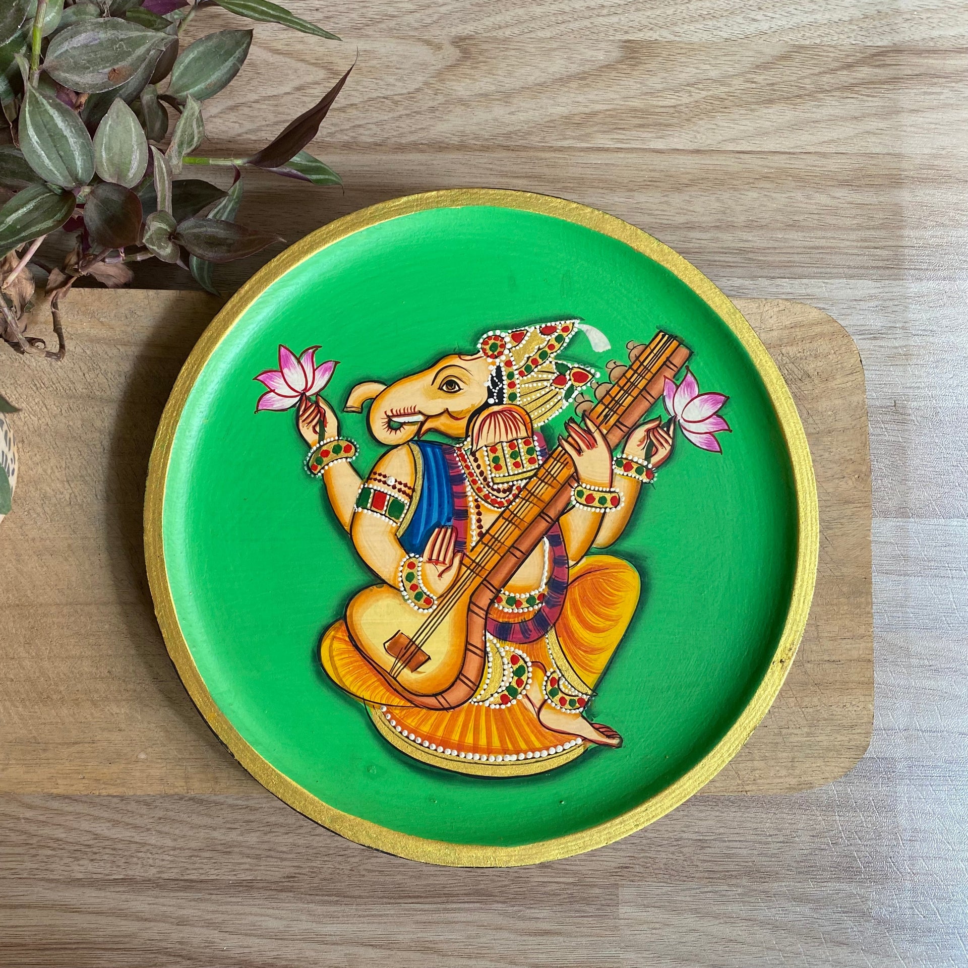 Invoke creativity and wisdom with this hand-painted Pichwai wallplate of Lord Ganesha playing the veena. Set against a lively green backdrop, this artwork symbolizes harmony, learning, and divine blessings—perfect for homes, studios, or gifting.