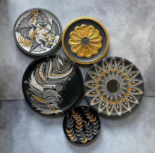 Elevate your walls with this stunning set of 5 handcrafted designer wall plates, featuring an exquisite fusion of black, white, and gold artistry. Each piece is thoughtfully designed with intricate floral and leaf motifs, creating a perfect balance of modern minimalism and timeless tradition.