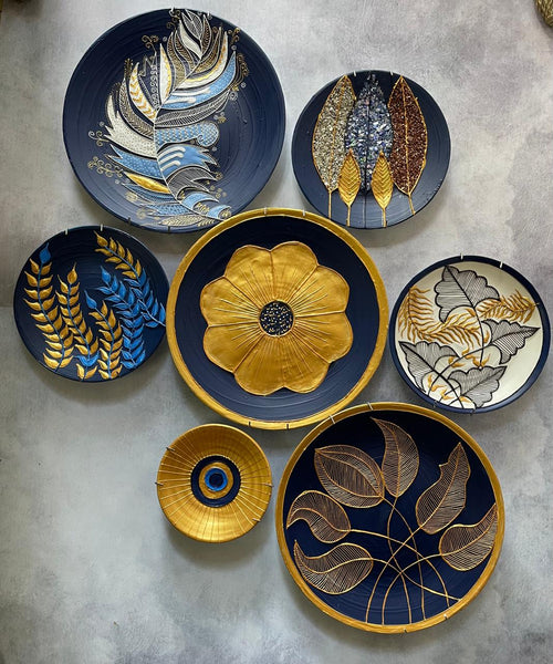 Turn your walls into a statement of elegance with this set of 7 handcrafted wall plates, beautifully detailed in bold shades of black, white, and gold. A harmonious mix of floral, abstract, and geometric designs, this collection is versatile enough to create a dramatic centerpiece or spread across multiple spaces.